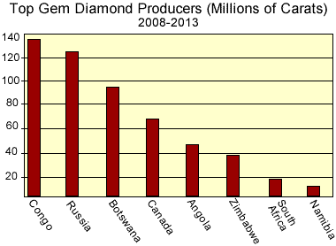 In 1775, important sources of diamonds were found in Brazil and with the discovery of the ones in South Africa in the 1870's, a dramatic increase in the diamond supply occured. Today, diamonds are mined in about 25 countries, with Europe and Antarctica being the only two continents excluded from the sources. Except for major wars and economic recessions, the production of diamonds have increased since the discovery of major pipes like ones in South Africa. The countries with the most production today are Congo, Canada, South Africa, Zaire, Botswana, Russia, and Angola.
